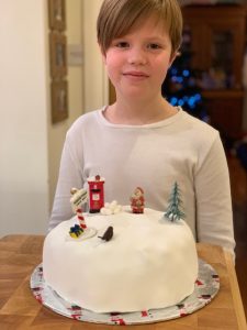In this post, there is a picture of the finished cake. I used some Christmas decorations and used some white fondant icing to make a pile of snow balls.