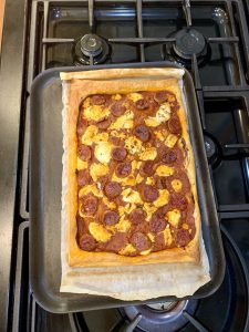 Today I made a goats cheese and chorizo tart! It was so nice. I used puff pastry and then covered it in tomato sauce. Then I crumbled goats cheese on it and put some chorizo on top.