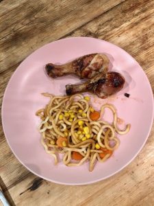 Preheat the oven to 200º or 180º fan. In a jug mix all the ingredients for the sauce together. Pour three quarters of the sauce over the chicken. Put this in the oven for 25 minutes. When the chicken is nearly ready, put about 1tbsp wok oil in a pan. Once this is hot, put the cooked noodles in. Wait 1 minute and then add the veg and leftover quarter of sauce. 🙂