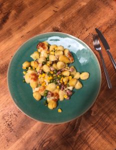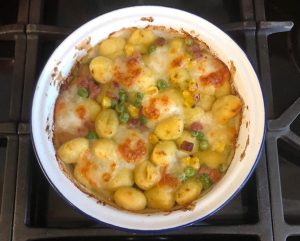 Hello! Today I made a gnocchi bake with bacon, mozzarella, peas, corn and pesto. Gnocchi bakes are one of my favourite foods. They are INCREDIBLY simple and easy to make, but absolutely delicious.